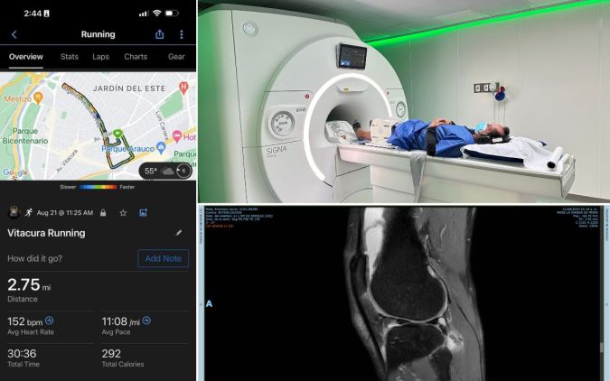 El diagnóstico del Dr. Luis Valenzuela de la Clínica Meds en Santiago de Chile que detuvo mis 3 años y 21 días corriendo todos los días, fue contundente: “Tienes evidentemente una artrosis femorotibial interna, con rotura degenerativa de menisco interno. También lesiones condrales en la rótula. Hay edema óseo del cóndilo femoral interno y de platillo tibial interno por el desgaste articular y la sobrecarga”.