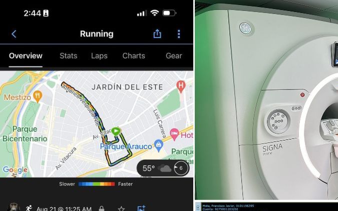 El diagnóstico del Dr. Luis Valenzuela de la Clínica Meds en Santiago de Chile que detuvo mis 3 años y 21 días corriendo todos los días, fue contundente: “Tienes evidentemente una artrosis femorotibial interna, con rotura degenerativa de menisco interno. También lesiones condrales en la rótula. Hay edema óseo del cóndilo femoral interno y de platillo tibial interno por el desgaste articular y la sobrecarga”.